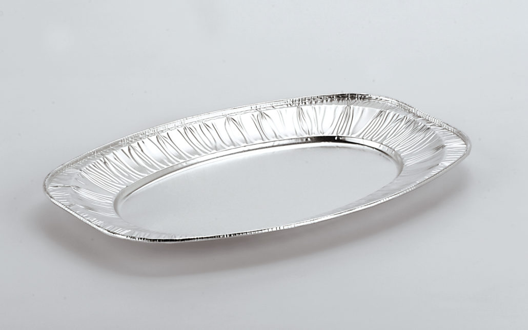 Vassoio in alluminio adatto al diretto contatto con alimenti, utilizzato come piatti di portata usa e getta.